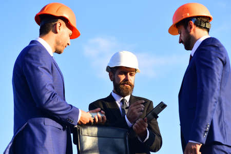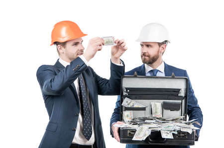 financial support. investment in architectural project. two men businessman in hardhat with money.