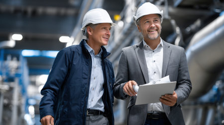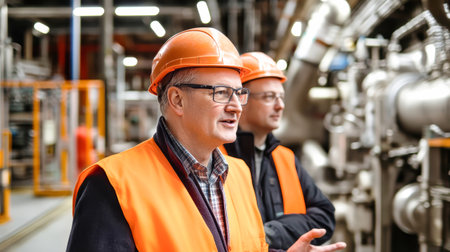 Two middle-aged engineers converse about work processes in a factory, dressed in safety gear and surrounded by industrial equipment.