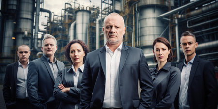 Unified team of managers and workers at a modern factory, showcasing collaboration and dedication. AI Generative AI