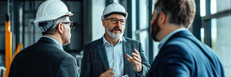 Three men in suits are talking to each other. One of them is wearing a hard hat. Scene is professional and serious