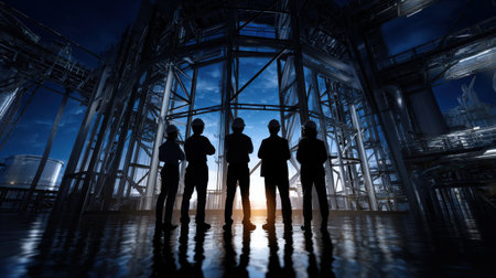 Silhouetted Workers in Helmets at Construction Site During Sunset.