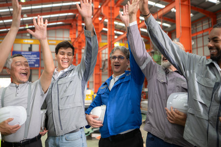 Factory workers celebrating achieving 100 percent efficiency milestone, showing their happiness for increased productivity and teamwork