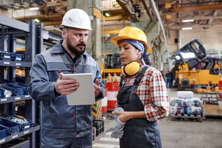 Bearded mature engineer with tablet making presentation of new technical project to young female colleague in factory