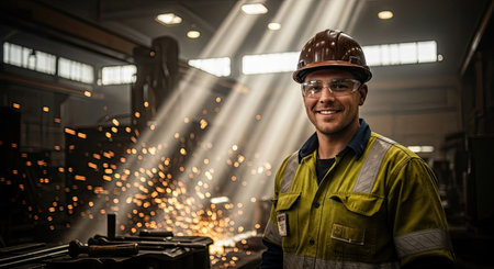 Close-up of a rugged industrial worker wearing a helmet and yellow gear, in a factory setting, with bokeh lights in the background.
