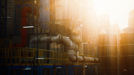 Sunlight filters through tall structures, casting warm hues on pipes and machinery. The industrial setting showcases advanced technology working at dusk, creating a dynamic atmosphere.