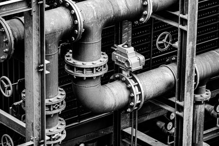 A sturdy metal control valve featuring a prominent handwheel and substantial bolts, integrated into an outdoor piping network for precise fluid regulation within ap