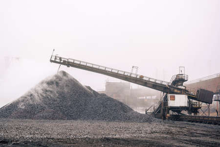 Spreader or absetzer - a mining transport vehicle on a walking-rail track for transporting and stacked hot briquetted iron at outdoors area of metallurgical plant