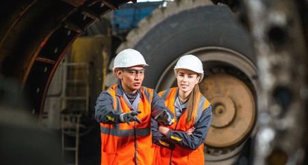 Female engineering manager and mechanic worker doing routine check up in industrial factory