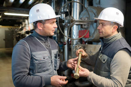 Technical manager discussion together with technical worker women in mechanical room at industry factory.