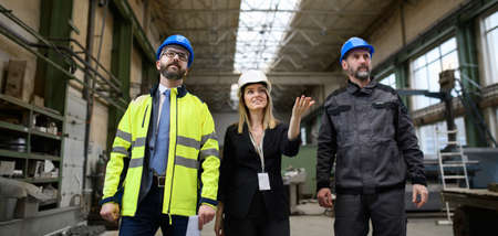 Manager supervisors and industrial worker in uniform doing control in large metal factory hall and talking.