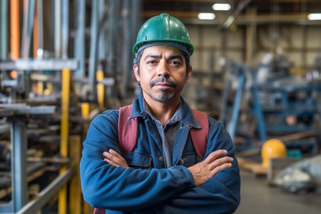 Portrait of construction worker in uniform is in the factory. Generative AI