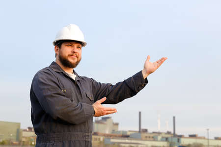 Portrait of american foreman in helmet with outstetched hands standing in construction site background. Concept of engineering profession and industrial development.