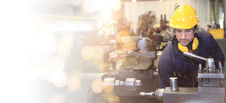 Engineering worker man wearing uniform safety and hardhat working machine lathe metal in factory industrial, worker manufactory industry concept.