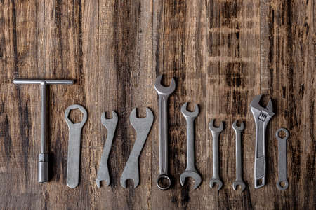 Top view of metal tools, wrenches and spanner on the background of old surface