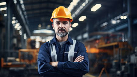 A skilled worker stands with arms crossed showcasing his professionalism in a manufacturing environment with machinery in the background.