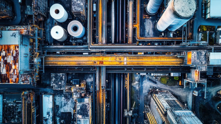 This stunning aerial view captures a complex industrial facility featuring intricate networks of pipes, tanks, and machinery, representing modern manufacturing.