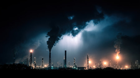 A captivating industrial scene at night, showcasing smoke billowing from factories and illuminated structures against a dramatic cloudy sky, highlighting environmental impact.
