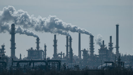 Black smoke escapes from tall chimneys in an industrial complex, creating a dramatic contrast against the overcast sky.