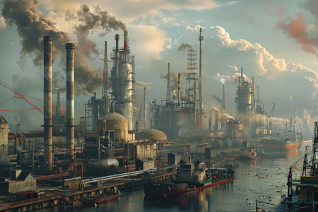 Polluted industrial landscape with towering smokestacks and rusting machinery under ominous skies