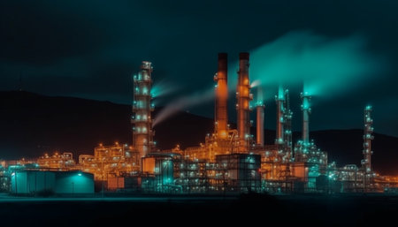 chemical plant smokestacks installation at night, chemical industry, generative ai