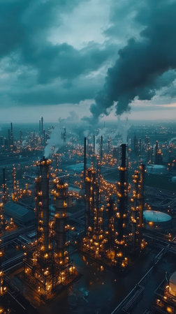 The oil refinery comes alive at night with glowing industrial lights highlighting its towering structures against a moody sky.