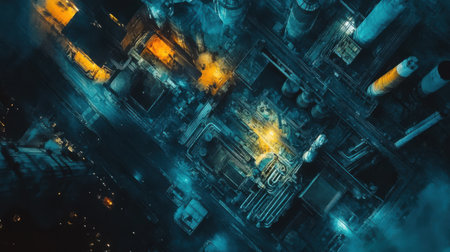 Captivating aerial view of an industrial complex at dusk, showcasing towering structures emitting smoke amid a misty atmosphere with bright lights illuminating the site.