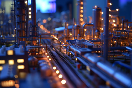 A detailed view of an industrial refinery with intricate pipes and structures, showcasing the complexity of modern manufacturing and energy production processes.