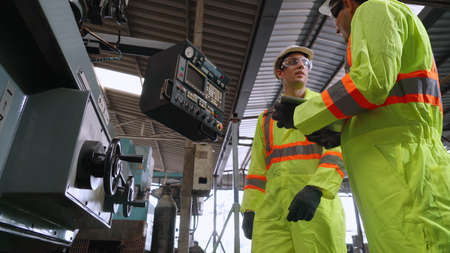 Engineering man wearing uniform safety workers perform maintenance in factory working machine lathe metal, industry work man concept.