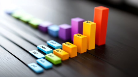 Vibrant 3D bar chart sits on a digital workspace, showcasing data analysis. The image represents growth, trends, and technology in modern business presentations.
