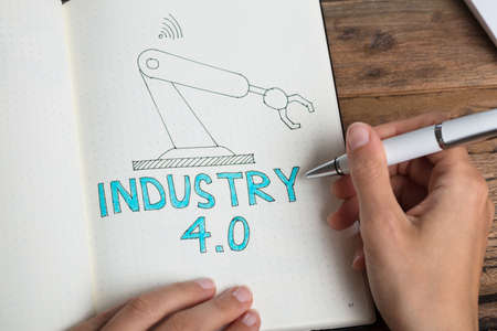 High Angle View Of A Human Hand Drawing Industry 4.0 Concept On Notebook