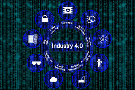 Digital revolution of manufacturing concept explaining the pillars of industry 4.0 in blue circles on a digital datastream background