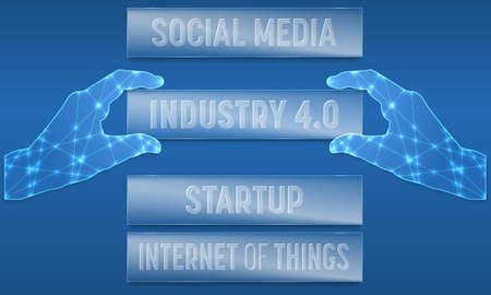 pen in hand and technology icons and the word Industry 4.0. Industry Infographics 4.0