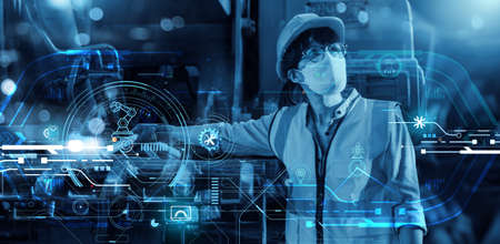 Engineer use augmented reality software in smart factory production line with automated application . Futuristic machinery in working in concept of Industry 4.0 or 4th industrial revolution.