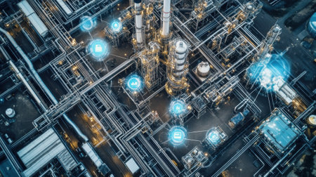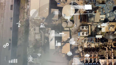 Future factory plant and inventive energy industry concept in creative graphic design. Oil, gas and petrochemical refinery factory with hologram showing next generation of power and energy business.