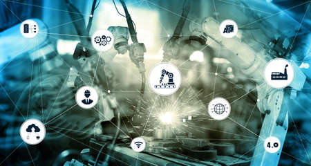 Industry 4.0 concept, iot, automation robot arms machine and monitoring system software, Welding robotics and digital manufacturing operation and industrial technology.