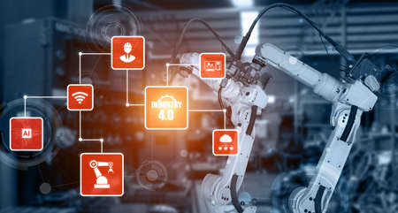 Smart industry robot arms for digital factory production technology showing automation manufacturing process of the Industry 4.0 or 4th industrial revolution and IOT software to control operation .