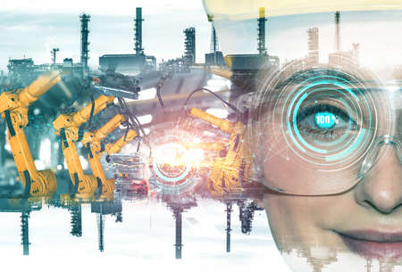 Engineer controls robotic arms by augmented reality industry technology application software. Smart robot machine in future factory working in concept of Industry 4.0 or 4th industrial revolution.