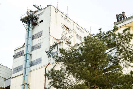 Giant tower of multistory production building. Picturesque old renovated working factory. Aged industrial object. Facade of big manufacturing high-rise building from trees. Industrial area close-up.