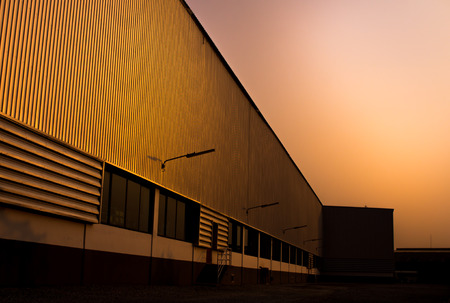 Industrial buildings at sunrise. Warehouses. Smoke from the pipe. Gradient.