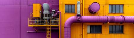 Vibrant Industrial Building with Bright Purple and Orange Painted Walls, Colorful Factory Exterior with Abstract Pipe System AI Generative