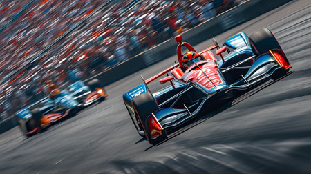 A stunning close-up image of a race car positioned on a track, showcasing intricate details, motion blur, and dynamic lighting that emphasizes speed and competition.
