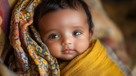 A peaceful baby lies on a soft blanket, embodying innocence and tranquility in a cozy environment.