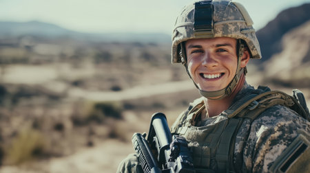 A young male soldier in desert combat gear smiles confidently during a military operation in a desert environment, holding a rifle.