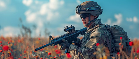A striking banner with a close-up of a soldier's gear, including a rifle, helmet, and tactical vest, set against a background of a battlefield.