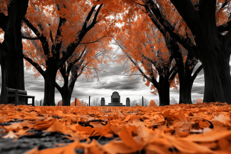 Infrared image of a cemetery with trees and water, AI