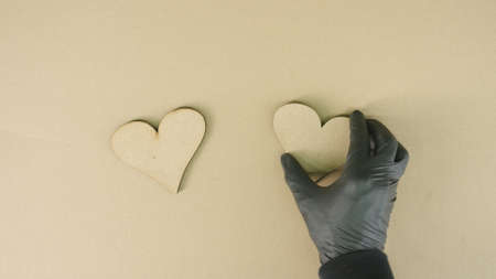 Putting two heart shape icons made of recycled cardboard on the table. Relationship concept