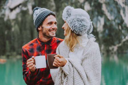 Beautiful couple of young adults visiting an alpine lake at Braies, Italy - Tourists with hiking outfit having fun on vacation during autumn foliage - Concepts about travel, lifestyle and wanderlust