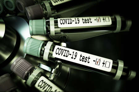 Test-tube with coronavirus test blood sample positive result. Close-up.