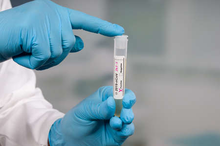 Lab doctor is holding in his hand a tube containing a swab sample that has tested positive for Covid-19. Testing for presence of coronavirus