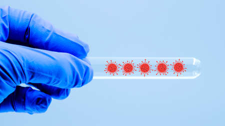 Coronavirus COVID-19 test tube in scientist hand on blue background.